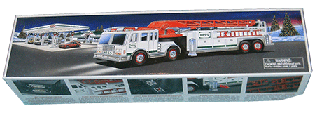 The 2000 HESS FIRE TRUCK, the first tractor-drawn aerial ladder truck, features two emergency sirens and a horn synchronized with flashing lights. Firefighting equipment includes removable side ladders and a 3-tiered, heavy-duty telescoping ladder that ro