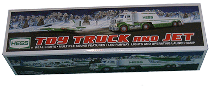 The 2010 Hess Toy Truck marks the first time a jet plane has joined the fleet, and offers the most sounds ever on a Hess toy! The 14-wheeler tractor trailer is loaded with chrome like detailing and working lights. The flatbed trailer doubles as a landing