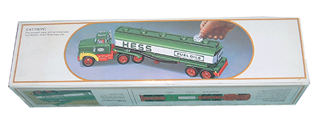 The HESS FUEL OIL TANKER WITH BANK is the same design as the 1977 tanker, made into a bank. The main feature added is a coin slot on the rear of the tanker. A chrome grill on the cab and bright red wheels enhance this model. A departure from earlier mode